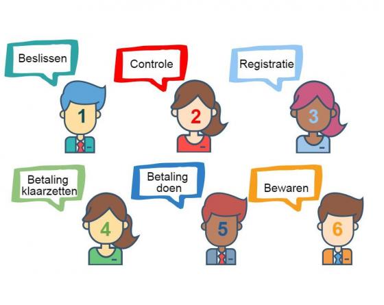 The management approves the budget and the project leader will make the orders. The managing board supervises whether or not the order is done correctly and when the bill will be paid. The treasurer ensures that the payment can be done through the bank (is there enough money?) and the accountant registers the bill as well as the payment thereof. It is important that there are always two sets of eyes involved for each step.